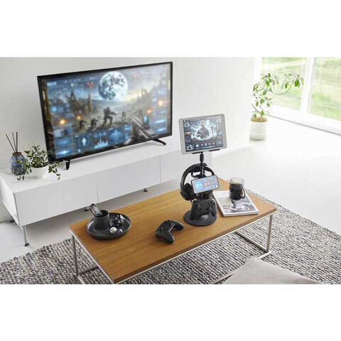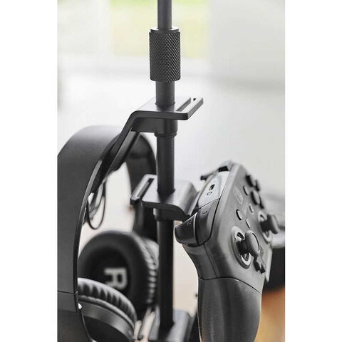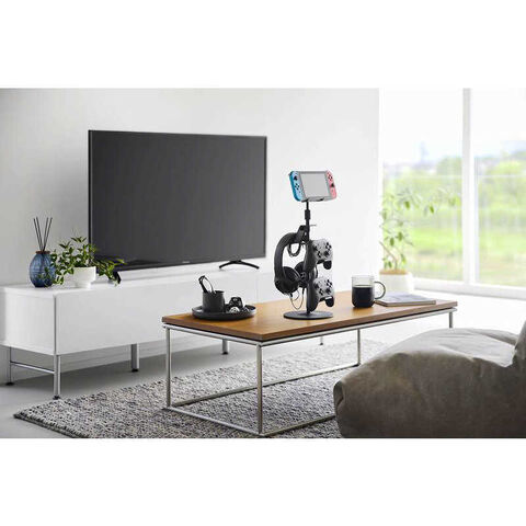 ゲーム機器やタブレットを設置したまま充電ができ、ヘッドホンやコントローラーも高さや向きを調節して収納できます。
