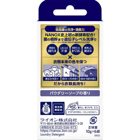成分:界面活性剤(55% ポリオキシエチレンアルキルエーテル、直鎖アルキルベンゼンスルホン酸塩、アルキルエーテル硫酸エステル塩)、pH調整剤、再汚染防止剤、安定化剤、酵素
