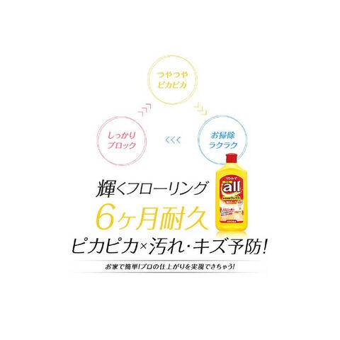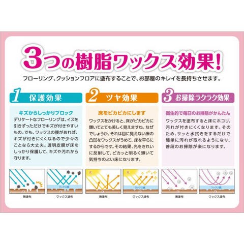 さまざまな床にぬれる万能樹脂ワックス。フローリング・クッションフロア・Pタイルなどに塗れます。塗って乾かすだけでピカピカの床に。耐久性は6ヶ月。約60畳分。