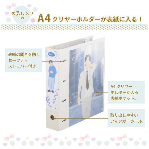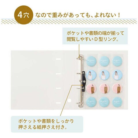 ポケットや書類の端が揃って閲覧しやすいD型リング。表紙の開きを防ぐセーフティストッパー付き。ポケットや書類をしっかり押さえる紙押さえ付き。※ポケットは付いておりません。A4クリヤーホルダーが入る表紙ポケット。取り出しやすいフィンガーホール。ラベリングやデコレーションができる背見出し紙付き。