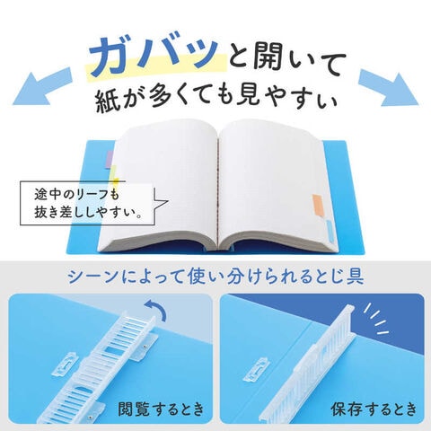とじ具に付いている2か所のロックを外すと、とじ具が倒れる仕様で、とじた後のリーフもめくりやすく、綺麗に閲覧できます。