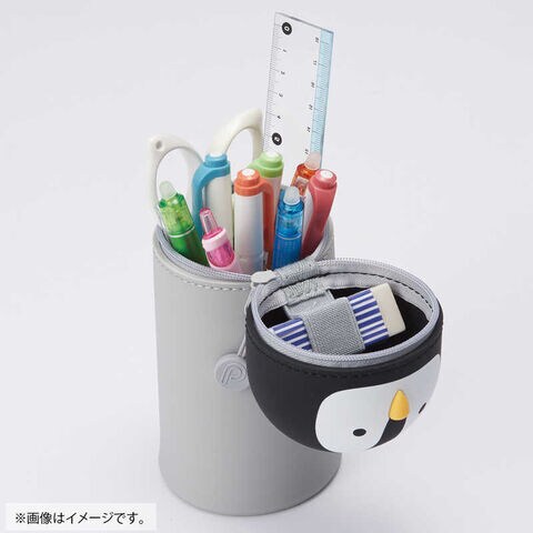 大好評の「立つ」ペンケース。上から押すだけでペンスタンドに早変わり。