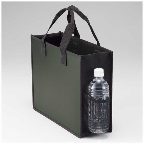 バッグの両サイドにはそれぞれ、ボトルが入るメッシュポケットとタイトル記入ができる見出し付き。