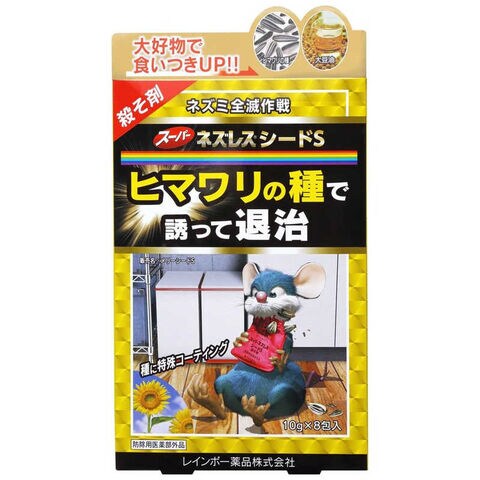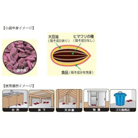 ・本剤は、ネズミの好む「ヒマワリの種」と「大豆油」を使用し、ネズミの食いつきを良くした薬剤です。