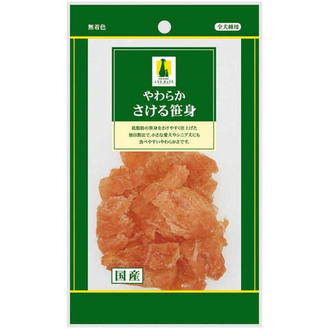低脂肪の笹身をさけやすく独自製法で仕上げた、小さな愛犬やシニア犬にも食べやすいやわらかさです。