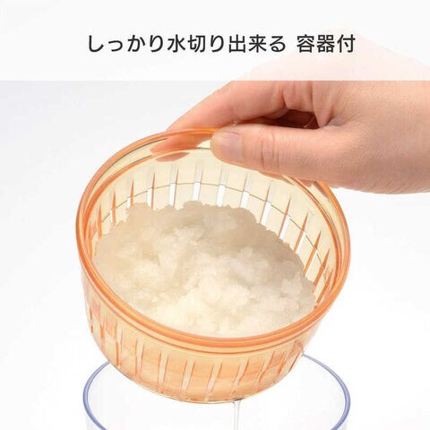仕様3:材質:フタ・ハンドル・ツマミ: ABS樹脂、回転ホルダー: ポリアセタール、おろしガード: ポリスチレン、おろしプレート: ポリアセタール、下容器: ポリスチレン、水切り容器: ABS樹脂、バネ: ステンレス鋼、下容器: ポリスチレン、すべり止め台座: シリコーンゴム