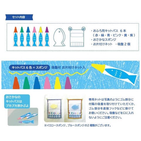 おさかなの巻紙のキットパス(6色)と、おさかな型のスポンジが入ったネットセットです。