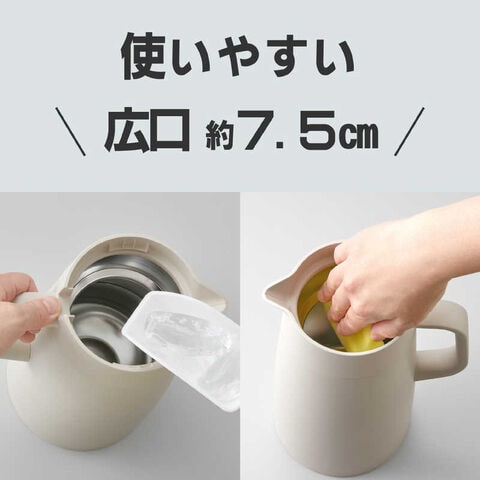 ◆使いやすい! こだわりの持ちやすさと注ぎやすさ◆お手入れかんたん! 汚れやにおいが付きにくいスーパークリーン加工◆着脱かんたん! ワンタッチ着脱ふた◆非電気だから電気代0円◆本体丸洗いOK!◆広口約7.5cmで大きな氷も入りやすい◆レバーをプッシュして傾けると中の飲み物が出てくるプッシュレバー