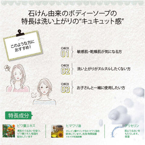 100%自然由来成分*のヒマワリ油を使用した、さっぱりやさしい洗い心地の石けんボディーソープ