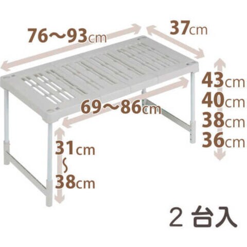 仕様・規格 最大外寸(約):幅76~93×奥行37×高さ36/38/40/43cm ※1台のサイズ棚下寸法(約):幅69~86×高さ31~38cm ※1台のサイズ積み重ね使用:2段まで可能全体耐荷重(約):30kg(積み重ねて使用時は合計で30kg)お客様組立品(工具不要)耐荷重(kg):30色:ベージュ幅(mm):760~930奥行(mm):370高さ(mm):360~430材質 棚板・脚:ポリプロピレン(PP)脚柱:スチール鋼管粉体塗装ストッパー用ボタン:真鍮ボタン用スプリング:スチール質量・質量単位 1.5kg