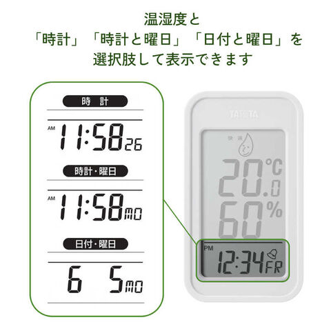 おしゃれなカラーマグネット、フック穴付き(測定範囲)温度5.0~50.0°(5.0°未満の時、「Lo」、95%を超えると「Hi」)(測定温度)温度0.0~40.0°±1.0°、それ以外±2.0°、湿度35~75% ±5%それ以外±10%(最小)温度0.1°単位、湿度1%単位(表示周期)約20秒に1回(機能)カレンダー表示(日付・曜日)時計表示(12時間・24時間切替)最高・最低温湿度表示