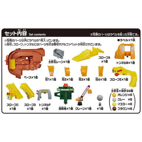 トミカのダンプカーやブルドーザを使った土砂玉の積み下ろし遊びやトンネル開通遊びが楽しめます。