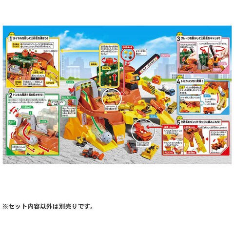 ●簡単組み立てで大きな工事現場が完成、デコボコ・ゴツゴツしたコースでトミカ手転がし走行が楽しめます。