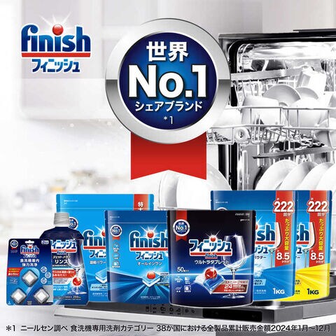 国内食洗機メーカー推奨ブランドNo.1(*1)を誇る食洗機専用洗剤・フィニッシュ。フィニッシュリンスはグラスと食器にさらに美しい輝きを与える乾燥仕上剤です。