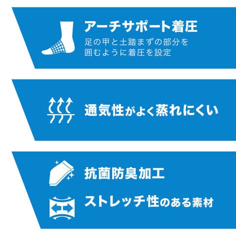 ・アーチサポート着圧: 脚の甲と土踏まずの部分を囲むように着圧を設定