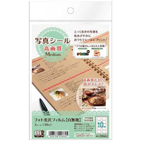写真シール〔フォト光沢フィルム(白無地)〕(ハガキサイズ・3シート・30片)29662