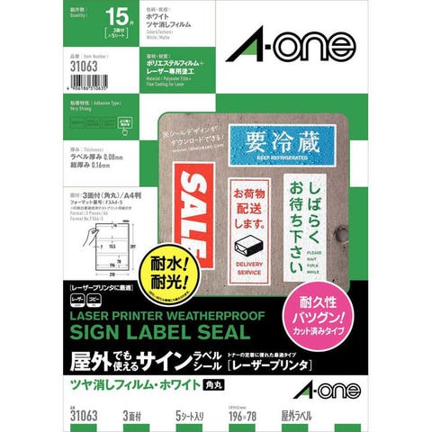 エーワン レーザープリンタ用手作りサインラベル ホワイトフィルム(A4・3面×5シート) 31063