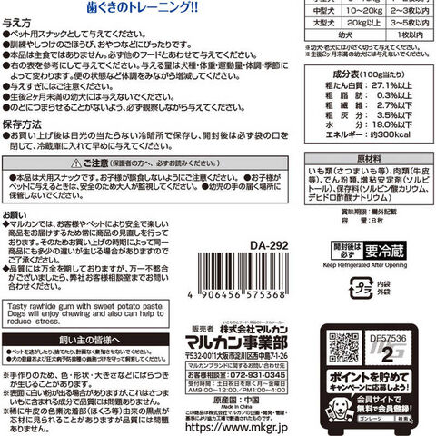 しっかり噛める牛皮ガムと食物繊維が豊富なさつまいものスナックです。