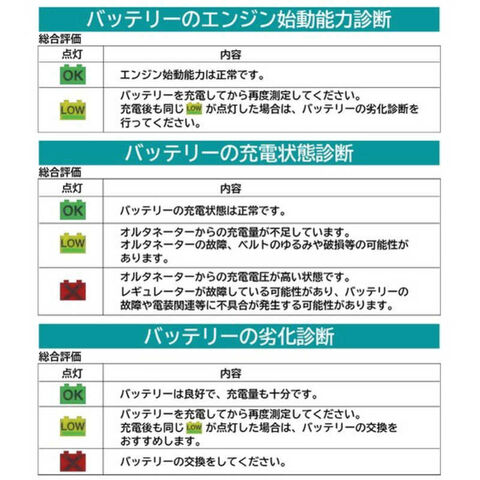 ●バッテリーの劣化状態・エンジン始動能力・オルタネーターの発電状態がわかる。