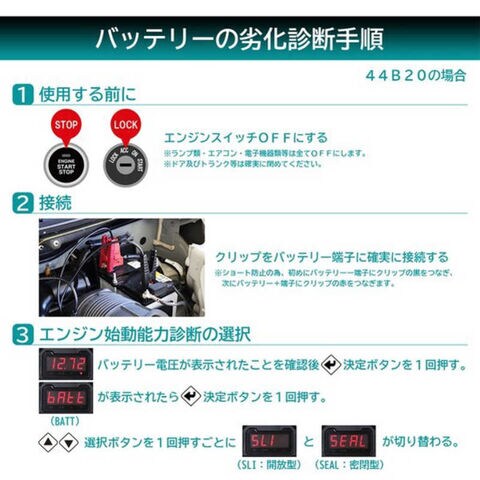 ●適合バッテリー:[DC12V]国産自動車12Vバッテリー、開放型(オープン)鉛バッテリー(液の補充ができるバッテリー)、密閉型(シールド、メンテナンスフリー)鉛バッテリー、アイドリングストップ車用バッテリー、ハイブリッド車用補機バッテリー、船舶用の12Vバッテリー(MCA判定)、AGM、ドライバッテリー