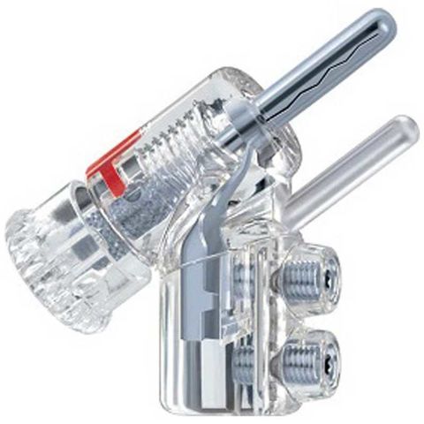 7mmφまでのスピーカーコードに対応したセンターピン方式を採用。 後部のスクリューを締めるとセンターピンがポールを押し広げてコンタクトを確実にします。 ガンタイプの形状とする事で奥行きが短くて済み、ラックの中に入れたアンプや、 背面スペースを取りたくないスピーカーシステムなどに便利です。また、ショート防止、感電防止対策も行い、 CEおよびIEC規格に適合しています。