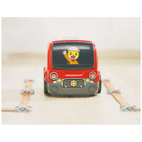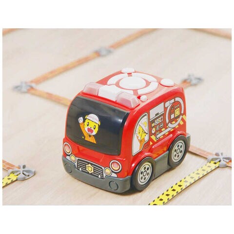 火災現場にしょうぼうしゃで向かう演出でプログラミング遊びがカンタンにできるアイテムです。