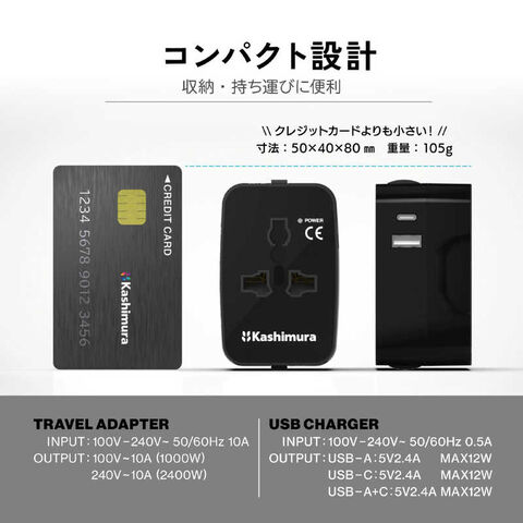 カシムラ 海外用変換プラグ A/C/O/BFタイプ USBA+C 2.4A WP-115Mのレビュー