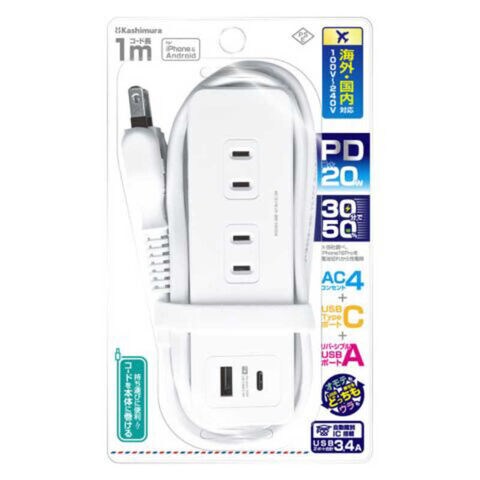 カシムラ 旅行用電源タップAC4 USBA+C PD20W 1m 自動識別 リバーシブル WM-28