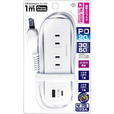 カシムラ 電源タップAC4 USBA+C PD20W 1.2m 自動識別 リバーシブル [1.2m /4個口 /2ポート] AC-054