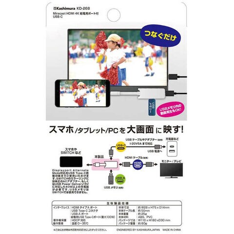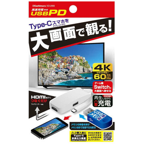カシムラ Miracast HDMI 4K 充電用ポート付 USB-C スマホ/タブレット/PC/Nintendo Switchをテレビに映せる PD充電対応 KD-268