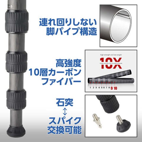脚材には高強度10層カーボンファイバーパイプを採用。内部には空回り防止機構が施されておりスムーズに伸縮・固定できます。先端のゴム石突は、設置場所の状況に応じて付属のスパイク石突に交換可能です。