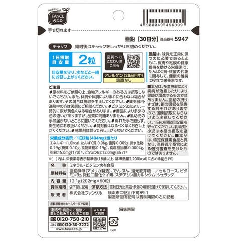 仕様1:原材料名: 亜鉛酵母、でんぷん、還元麦芽糖/セルロース、ビタミンB2、微粒二酸化ケイ素、ステアリン酸カルシウム、シェラック