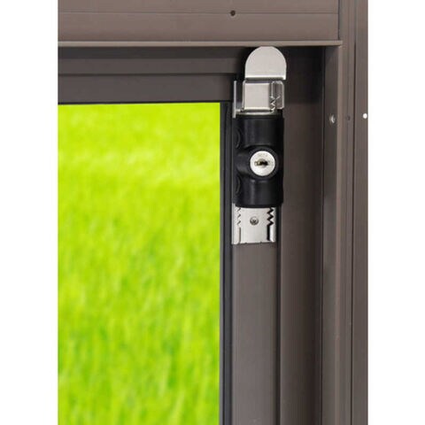 ●プレート(ステンレス製)を窓ガラスを囲う框(かまち)部分に両面テープとネジでしっかりと取付け、プレートに鍵付の本体錠を通して施錠します。