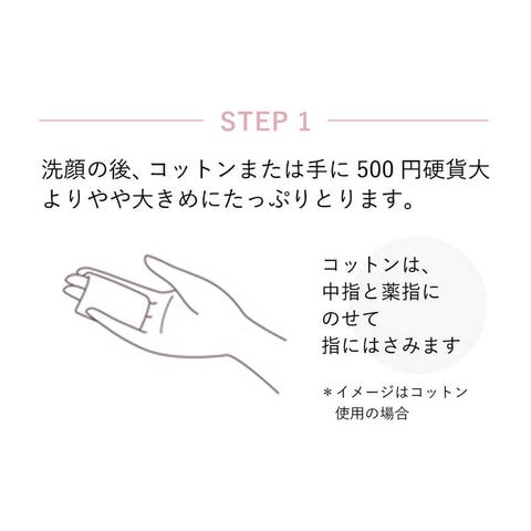 ●洗顔の後、コットンまたは手に500円硬貨大よりやや大きめにたっぷりとり、ていねいになじませます。