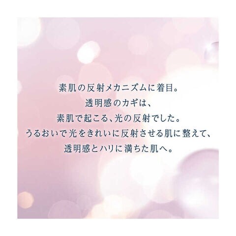 透明感のカギは、肌がきれいに光を反射させること。美白有効成分配合のブライトリフレクト処方で、うるおいに満ちた、光をきれいに反射する肌に整え、透明感を与えます。さらに美容成分配合で、肌にふっくらとしたハリを与えます。