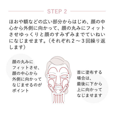 ●化粧水の後、コットンまたは手に10円硬貨大よりやや大きめにたっぷりとり、ていねいになじませます。