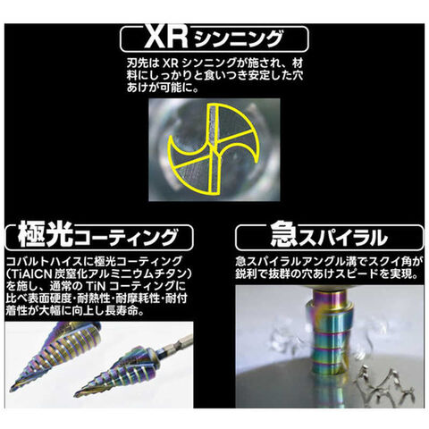 ●刃先は XR シンニングが施され材料にしっかりと食いつき安定した穴あけが可能です。