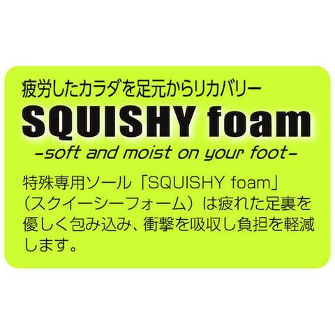 ●特殊専用ソール「SQUISHY foam(スクイーシーフォーム)」は疲れた足裏を優しく包み込み、衝撃を吸収し負担を軽減します。