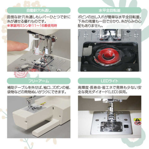 付属品:ジグザグ押え(本体に装着)・ファスナー押え・ボタンホール押え・ボタンつけ押え・シームガイド・ドライバー・針・ボビン3個・リッパー/ブラシ・糸こま押え・糸こま押え(小)・補助糸立棒・糸コマ座・説明書・ソフトカバー・フットコントローラー(電源コード一体式)