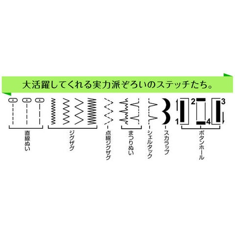 ダイヤルを合わせるだけで、ジグザグ、まつりぬい、点線ジグザグ、ボタンホールなどがぬえます。