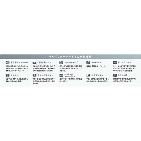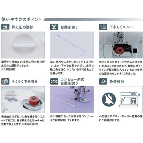 付属品:ジグザグ押え(本体に装着)・ファスナー押え・ボタンホール押え・まつりぬい押え・ふちかがり押え・サテン押え・糸巻き押え・針板用ドライバー・ドライバー・針・ボビン・リッパー・ブラシ・説明書・ハードケース
