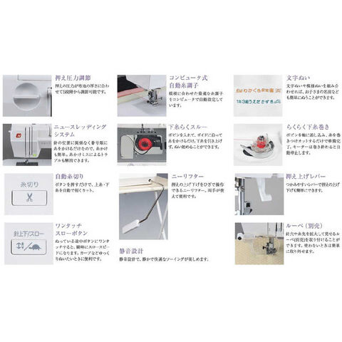 付属品:ジグザグ押え(本体に装着)・ファスナー押え・ボタンホール押え・まつりぬい押え・ふちかがり押え・サテン押え・直線押え・レザー押え・直線用交換針板・ひざ上げレバー・糸巻き押え・針板用ドライバー・ドライバー・針・ボビン・リッパー・ブラシ・説明書・ハードケース・フットコントローラー・大型テーブル