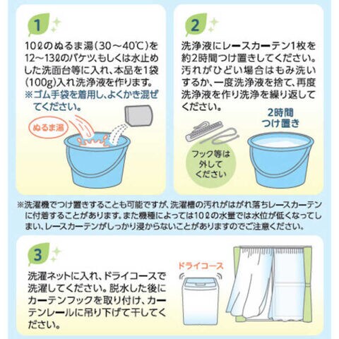 使用量目安:10Lのぬるま湯(30~40℃)に入れたレースカーテン1枚(約100cm~丈210cm~230cm)に対して1袋(100g)