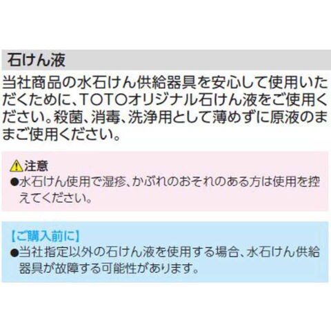 当社商品の水石けん供給器具を安心して使用いただくために、TOTOオリジナル石けん液をご使用ください。