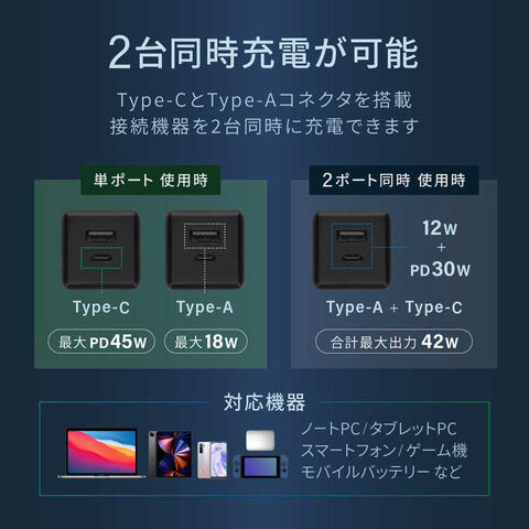 最大45W出力が可能なため、対応機器の充電時間をぐっと短くできます。