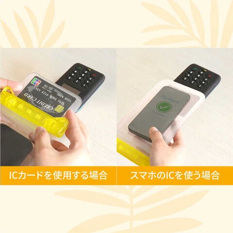 ポケット部分にICカードを入れた状態でタッチ決済をおこなうことができます。