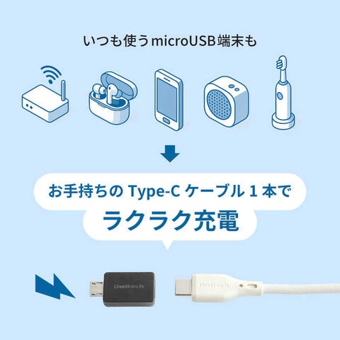 新たにmicroUSBケーブルを買い足すことなく、本製品をお手持ちのUSB Type-Cケーブルに装着するだけでmicroUSB搭載機器をお使いいただけます。
