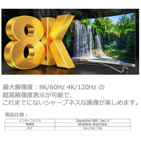 仕様1:[端子]DisplayPortオス - DisplayPortオス[インターフェイス]DisplayPort 規格:Ver1.4[解像度]8K@60Hz / 4K@120Hz[金メッキピン・コネクター]サビに強く、映像信号劣化を抑えます[ご注意]製品は国内向けの汎用品であり、全ての組み合わせにおいて動作を保証するものではありません。製品及び付属品のデザイン・色・仕様等は予告なく変更される場合があります。