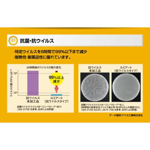 ●抗菌・抗ウイルスでは、特定ウイルスを8時間で99%以下まで減少します。
