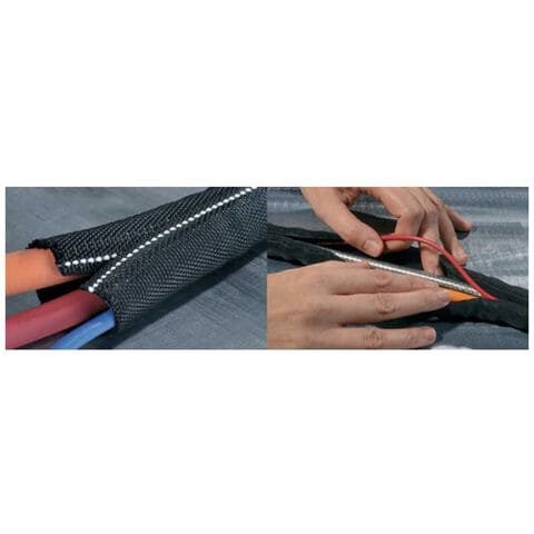 ●ヘラゲインTI は、自己巻き付け式の編組スリーブで、ワイヤーハーネスの損傷を軽減します。